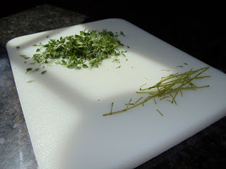 First we made a trip to to Perennial Herb Garden to pick Thyme. We separated the leaves from the stems and then chopped. We needed 2 Tablespoons. We had one.